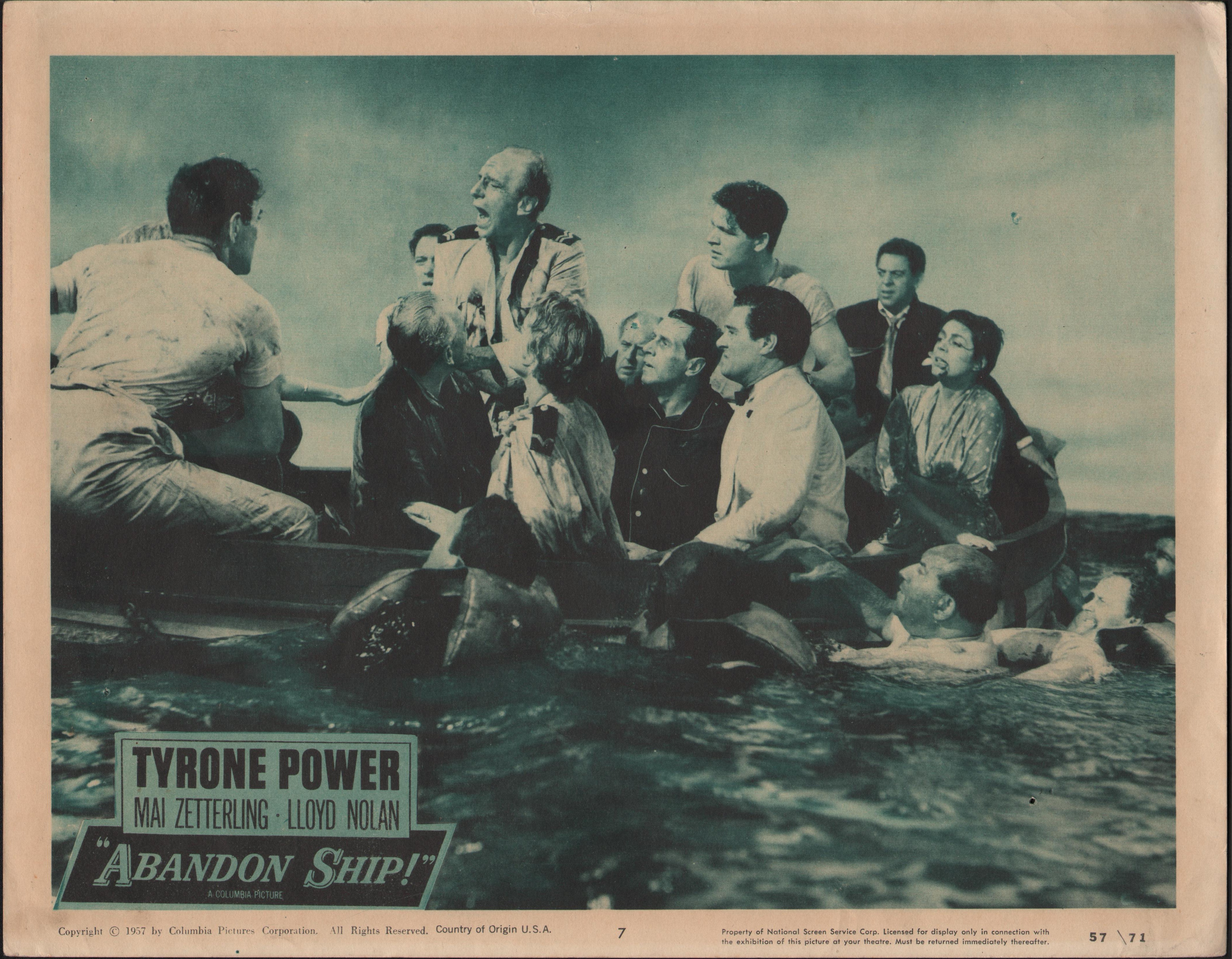 Original 1957 Re-release for Columbia Pictures “Abandon Ship”, starring Tyrone Power, Mia Zetterling and Lloyd Nolan. lobby card 7. Numbered 57/71 11in x 14in