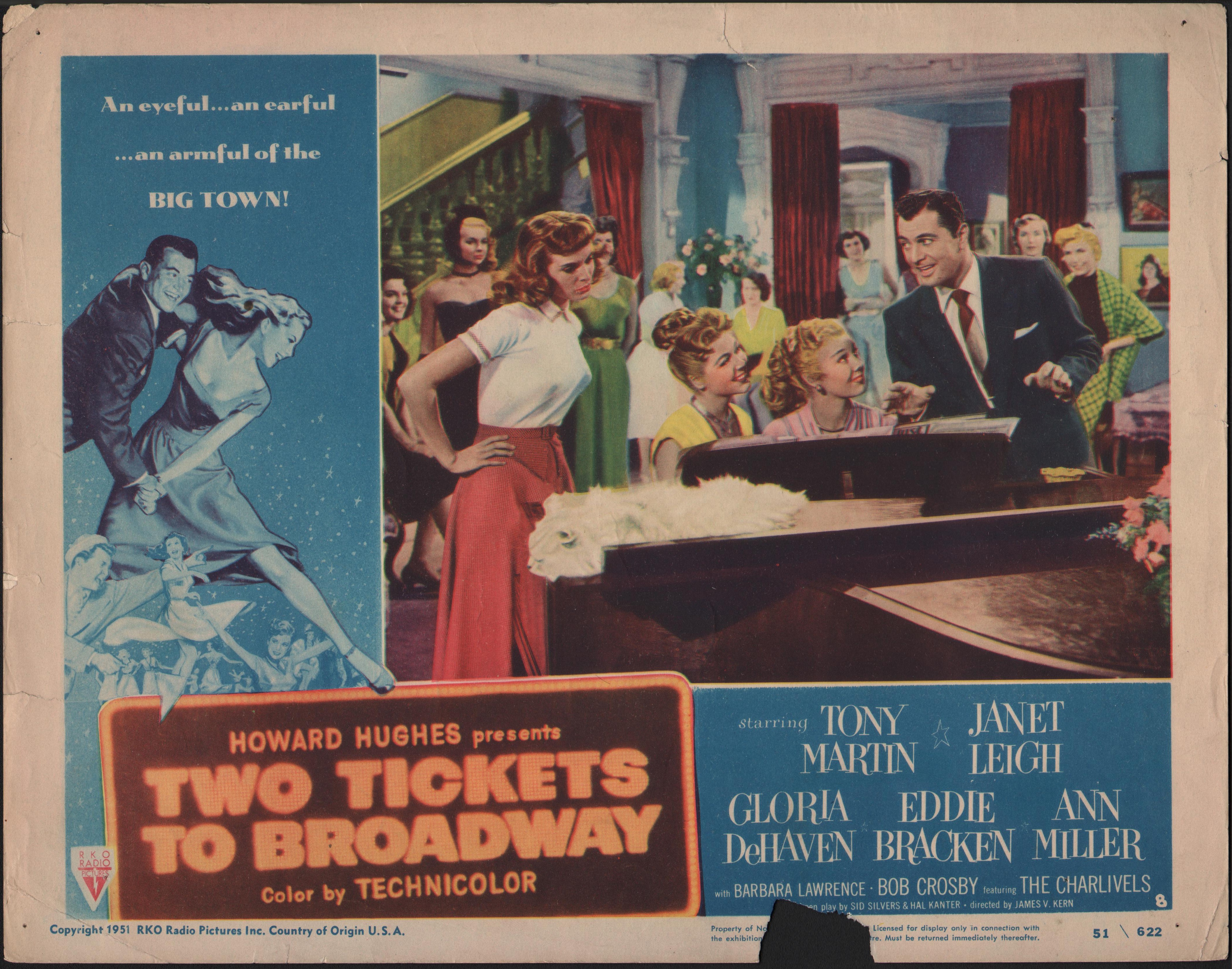 Original 1951 RKO Radio Pictures “Two Tickets To Broadway”, starring Tony Martin, Janet Leigh, Eddie Bracken, Ann Miller and Bob Crosby. Lobby card 8. Numbered 51/622 11in x 14in