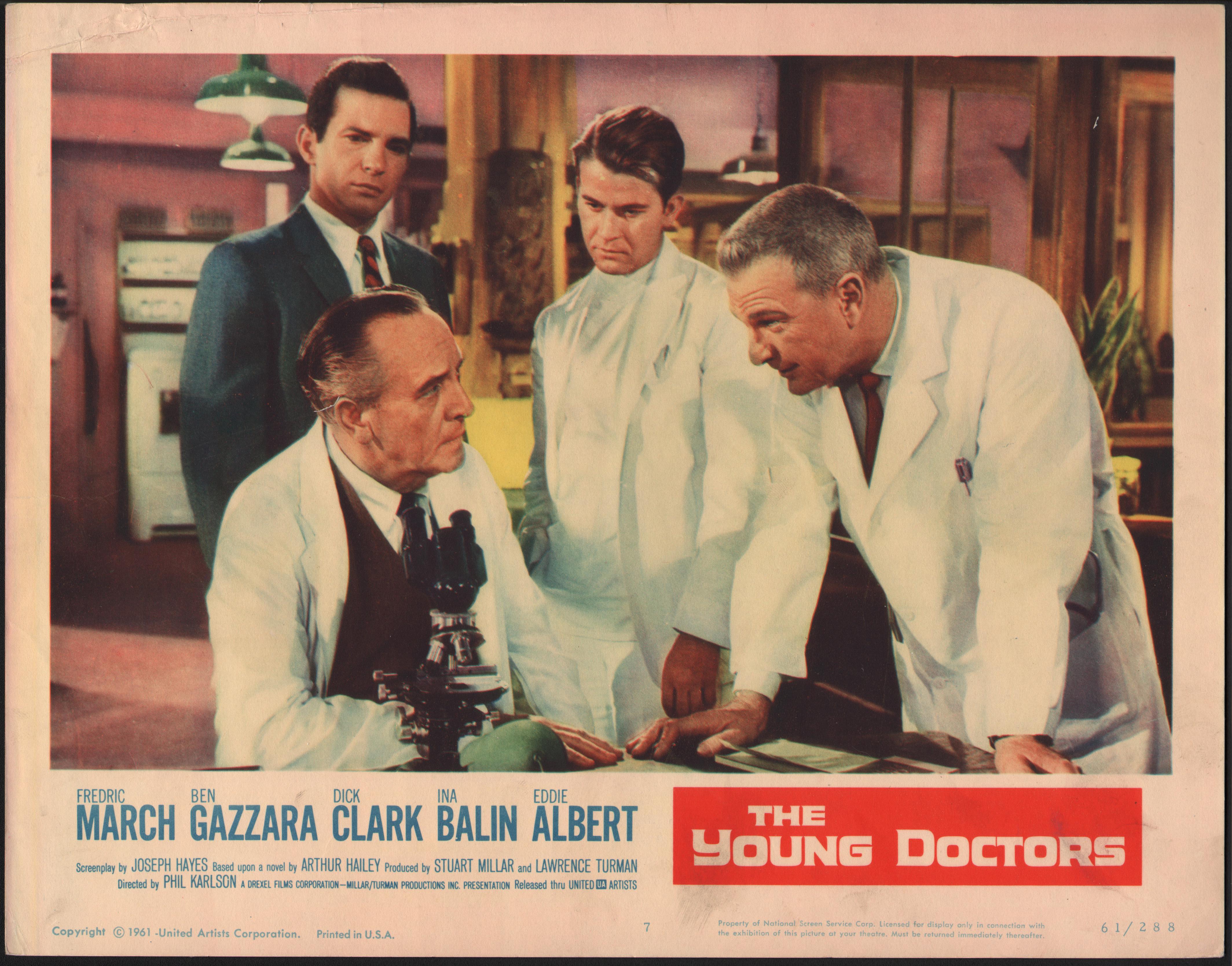 Original 1961 United Artists “The Young Doctors”, starring Fredric Marsh, Ben Gazzara, Dick Clark, Ina Balin and Eddie Albert. Lobby card 7. Numbered 61/288  11in x 14in