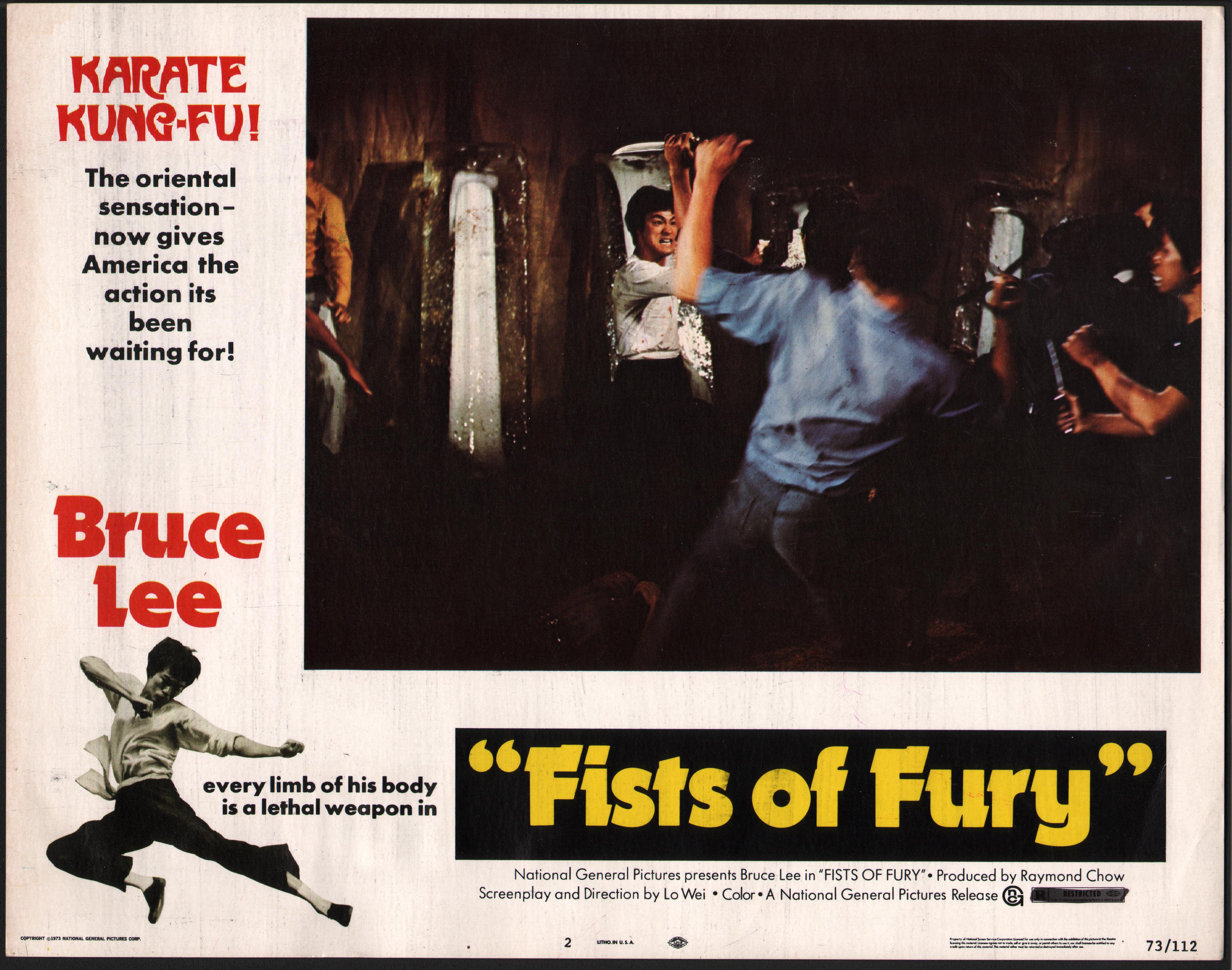 Original 1973 Re-release from National General Pictures for “Fists of Fury”, starring Bruce Lee. Lobby card 2. Numbered 73/112 11in x 14in