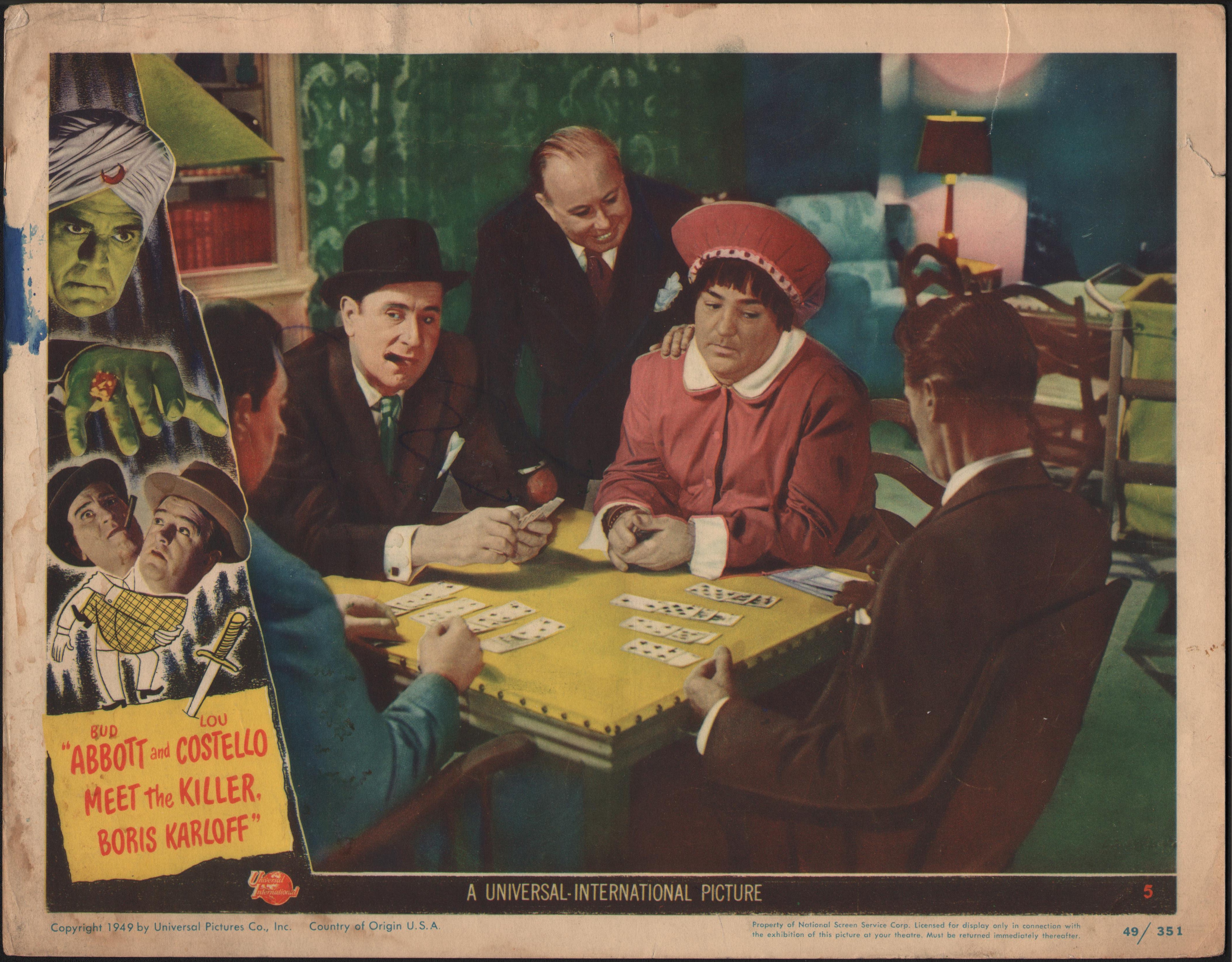 Original 1949 Universal Pictures “Abbott And Costello Meet The Killer, Boris Karloff”, starring Bud Abbott, Lou Costello and Boris Karloff. Lobby card 5. Numbered 49/351 11in x 14in