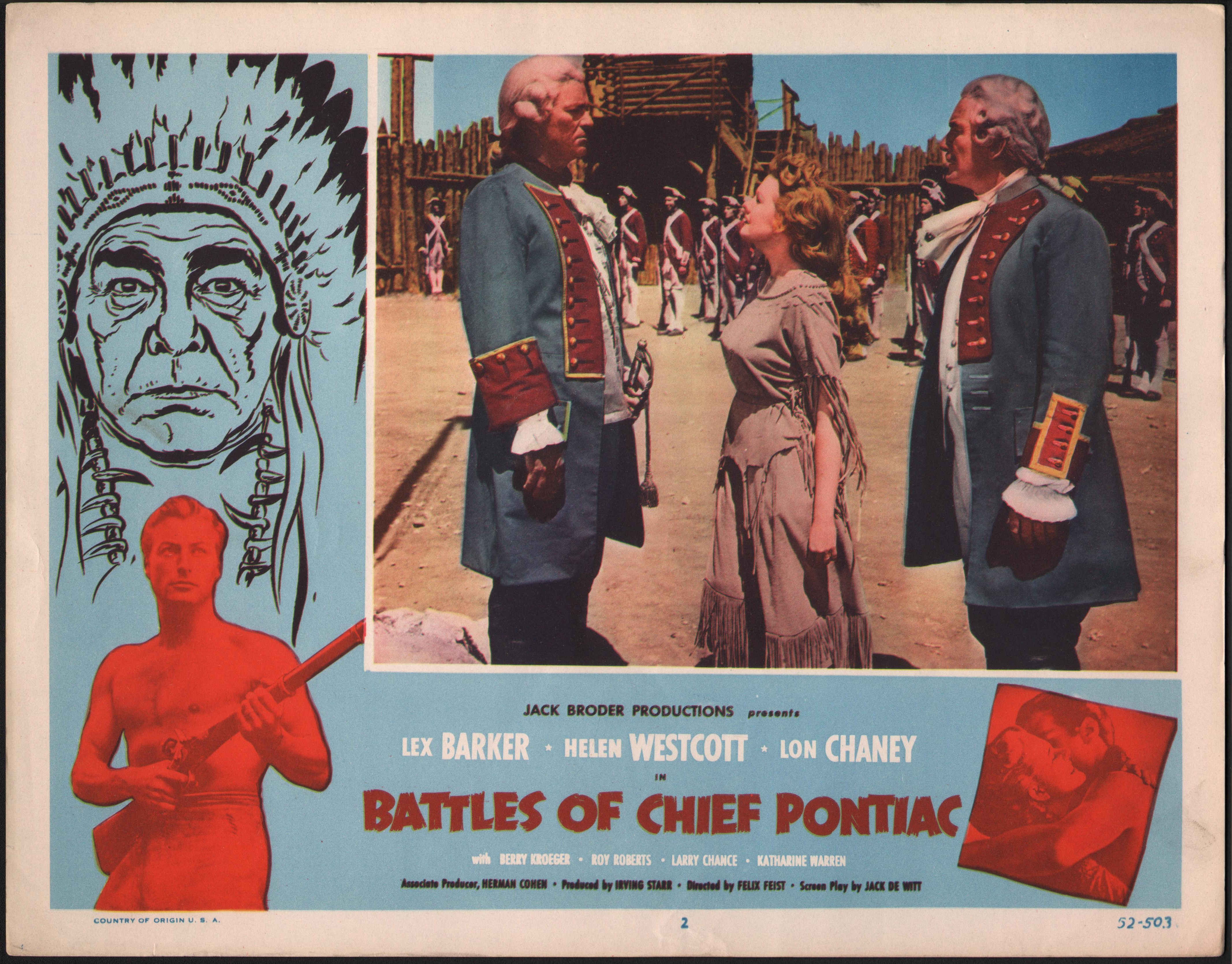 Original 1952 Realart Pictures “Battles Of Chief Pontiac”, starring Lex Barker, Helen Westcott and Lon Chaney,Jr. Lobby card 2. Numbered 52-503 11in x 14in
